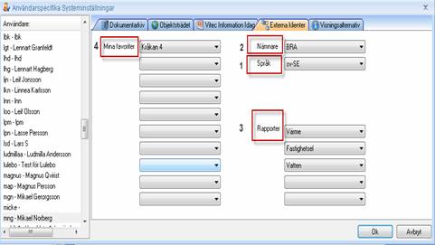 Välj den flik som heter Externa Klienter. Till vänster syns alla användare som finns upplagda i VE och den som är inloggad i VE är vald deafult. Detta innebär att en person kan administerar för alla användare av Energiwebben.