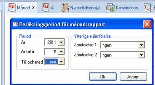 I det högra nedre hörnet finns en ikon som indikerar att det finns utökad funktionalitet för Beräkningsperiod. Klickas ikonen kommer dialogrutan i bilden nedan att visas. Här är det möjligt att, förutom att ange År och Antal år, ange vilken slutmånad rapporten skall ha (bara i Månadsrapport).