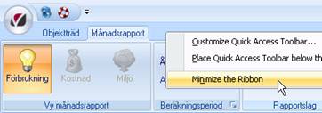 För att dölja menyradsflikarna, högerklicka i gränssnittets övre del och välj ”Minimera menyradsflikarna” enligt Bild 8.