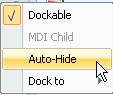 Genom att växla mellan ”Dockningsbar” och ”Auto göm” enligt Bild 11 , ändras egenskaperna för fönstret så att det döljs och blir tillgängligt via en flik.