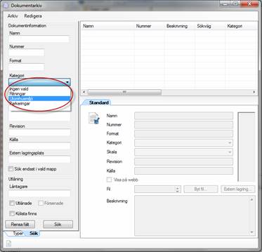 Via Dokumentkategori går det att lägga till olika texter som användaren kan kategorisera sina dokument med. Dessa kategorier går sedan att söka via sökfunktionen i Dokumentarkivets kärna, se bilden nedan.