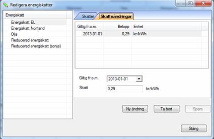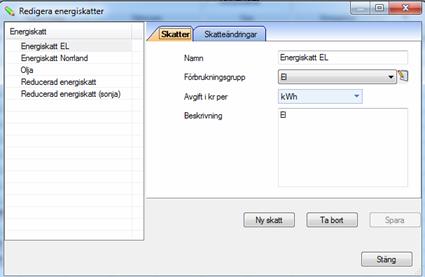 Gränssnittet för att hantera energiskatt öppnas via Grunddata / Kostnader miljö / Energiskatt.