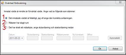 Om ett värde matas in som är lägre än föregående månads inmatning så kommer en ruta upp där följande val kan göras.