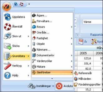 Det går att arbeta med målvärden och referensår i månadsrapporter. Dessa inställningar finns under Vitecknappen / Grunddata / Jämförelser. Här kan du bestämma ett referensår som du kan jämföra dina förbrukningar emot. Du kan även bestämma dina förbrukningsmål och arbeta med att uppnå dem.