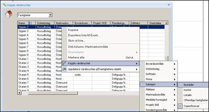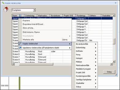 För att koppla en fastighet till en värdenyckel, markera fastigheten och högerklicka för att välja Koppla värdenyckel.