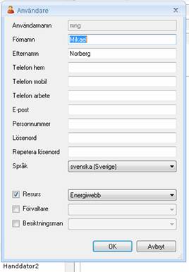 Klicka i rutan Resurs, leta sedan upp rätt resurs och koppla den till användaren och tryck på OK. Om resursen saknas så måste den skapas i VE och sedan koppla mätare till den, se separat kapitel för detta.