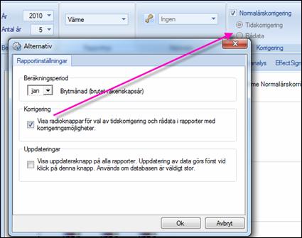 För att få valet Rådata väljes detta i inställningsfönstret Inställningar/Alternativ (via Vitec-knappen). Det är endast rapporten Värme som kan normalårskorrigeras.