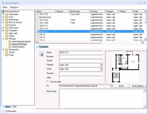 Dokumentarkivet (se bild nedan) nås via Vitec-knappen / Verktyg / Dokumentarkiv eller snabbkommandot Ctrl+D på tangentbordet.
