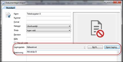 Exempelvis bör kanske en viss (fysisk) karta som återfinns i arkivskåp B i ett företags källare kopplas till ett objekt i Vitec Teknisk Förvaltning. Om användaren nyttjar ”’Lägg till externt dokument” och därefter anger relevant information i dokumentets egenskaper (se bilden nedan) blir det lättare för den som vill titta på kartan att faktiskt veta vart den återfinns.