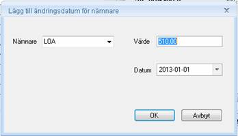 I droplistan föreslås den nämnare man har markerat i vänstra tabellen men man kan ändra till annan nämnare om man vill. Enbart nämnare som är kopplade till aktuell applikation och entitet är valbara. Ange värde och datum och tryck OK. Man återgår då till föregående dialog och det nya värdet visas.