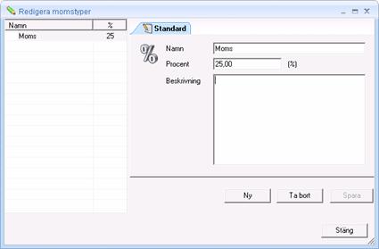 Här finns inlagt momstypen 25 % vilket är den enda som skall användas.