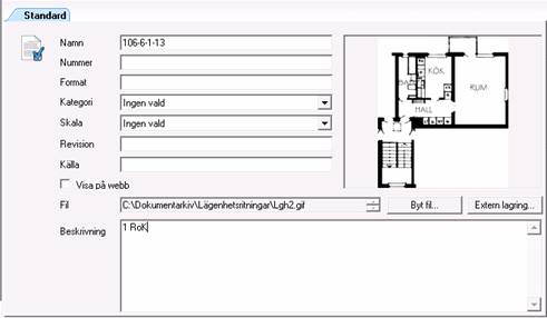 Genom att skriva in nya texter eller byta text i dropplistorna är det möjligt att ändra/lägga till information för ett dokument. Det är möjligt att byta ut själva filen till en annan, eller bestämma lagringsplats för dokumentet.