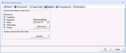 Inställningar som rör tidstämplade nämnare i Vitec Nova, eller en extern källa, synkroniseras under fliken ”Nämnare”.