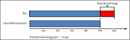 Principen för nyckeltalsanalysen där man jämför förbrukningen för ett antal fastigheter eller strukturer från ett år (”År” på bilden”) till ett annat (”Jämförelseår” på bild 82) och belyser förändringen. I exemplet har förbrukningen för vald tidsperiod (jan – maj) ökat med 10 och det är den förändringen som belyses i rapporten. Förändringen som visas kan vara både en ökning och en minskning.