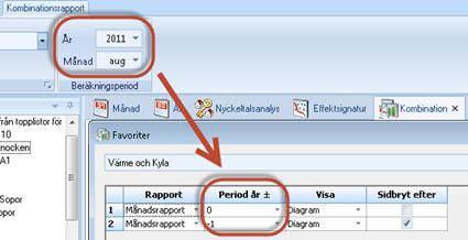 Avgör hur innehållet i aktuella paneler ska förhålla sig till inställningarna för ”År” i ”Beräkningsperiod”. Enligt exemplet i bild 118 är beräkningsperioden satt till 2011, rapporten i panel 1 som har inställningen ”0” kommer att då utgå från 2011 medan rapporten i panel 2 som har inställningen ”-1” kommer att visa år 2011 -1 = 2010.
