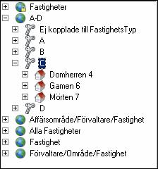 För att vidare analysera en av de underliggande nivåerna i exemplet ovan, behålls befintliga rapportinställningar medan rapporturvalet förändras. Markeras nivån ”C” nedan skapas en nyckeltalsanalys som visar de ingående delarna för ”C”, det vill säga fastigheterna ”Domherren 4”, ”Gamen 6” samt ”Mörten 7”.