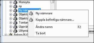 Om man högerklickar på en nämnargrupp visas en popup-meny där man kan välja att skapa ny nämnare, koppla befintliga nämnare, ändra namn samt ta bort hela nämnargruppen.