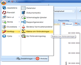 För att det ska gå snabbt att ta ut rapporter i VE räknas förbrukningarna ut och lagras i databasen. Under vissa förutsättningar, exempelvis då man importerat värden måste man köra verktyget under Vitecknappen/ Verktyg/ Räkna om förbrukningar.