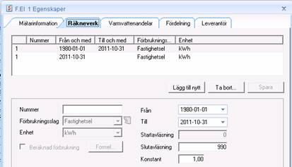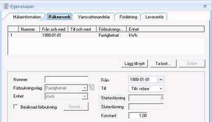 Utifrån den mätarmall som valdes då mätaren skapades kommer det i den över delan att finns en eller flera rader (räkneverk) definierade.
