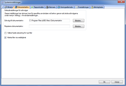 Det finns ytterligare ett fält i fliken ”Dokumentarkiv” i vilken ”Filsystems Dokumentarkiv” anges. Detta är en länk till en fysisk mapp på hårddisken (eller någon server) och har egentligen ingenting att göra med Vitecs virtuella Dokumentarkiv. De filer som syns då användaren angett en sökväg här visar enbart en spegling av en hårddisk.