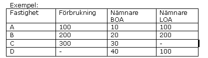 · Förbrukning / nyckeltal BOA blir 10 ((100+200+300)/(10+20+30)) Fastighet D tas ej med eftersom enbart fastigheter som har förbrukning tas med.