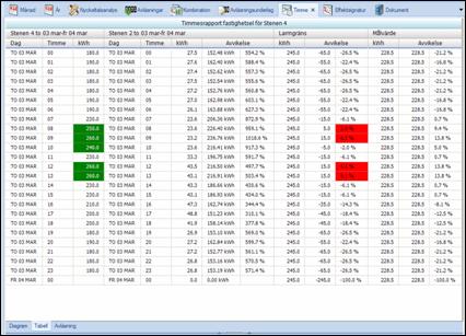 Timmesrapportens tabell innehåller vald periods timvärden för vald fastighet eller mätare.
