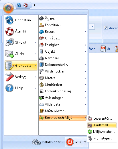 Gränssnittet för att hantera tariffmallar öppnas via Grunddata / Kostnader miljö / Tariffmall enl. bild nedan.