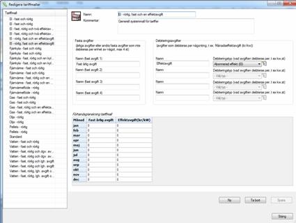 Till vänster i bilden ser du de olika tariffer som är förvalda och installerade.