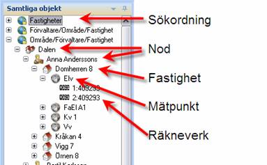 Delen samtliga objekt har flera funktioner. Här bestämmer man vilket urval som ska visas i rapporter. Bild 4 nedan visar ”Samtliga objekt” där alla fastigheter i databasen inordnas i så kallade sökordningar och nivåer.