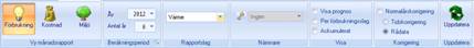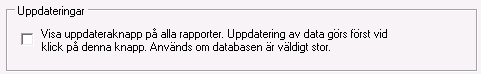 Som standard sker uppdatering av rapporter automatiskt då tex. annan fastighet markeras i trädet. Om databasen är väldigt stor så kan den automatiska uppdateringen slås av och uppateringen av rapporten görs manellt genom att klicka på Uppdatera knappen.