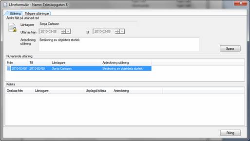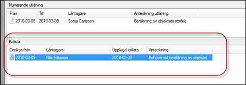 I det fall någon ny person är intresserad av att låna dokumentet kan användaren lägga upp den nya personen i kölistan genom att ange namn och datum (och eventuell anteckning) och därefter klicka på ”Spara”.