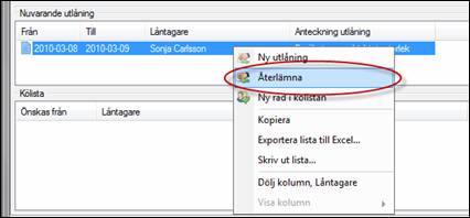 När personen som lånat dokumentet lämnar igen det högerklickar användaren i listan över nuvarande utlåningar och väljer ”Återlämna”.