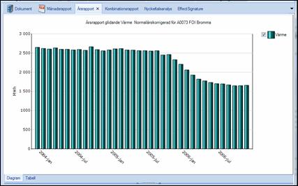 Diagrammet ändras till att visa månadsstaplar för de år man valt. Varje månadsstapel visar nu ett års ackumulerad förbrukning. (Stapeln 2004-jan visar förbrukningen för Februari-december 2003 + förbrukningen för januari 2004).