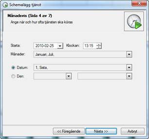 Fälten Starta och Klockan anger datum och tid för nästa körning av tjänsten. Listan Månader anger under vilka månader som tjänsten ska köras.