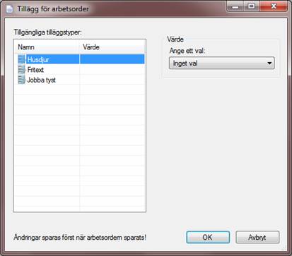 Alternativen som finns i dialogen ”Tillägg för arbetsorder” kan läggas till via ”Grunddata”à”Arbetsordrar”à”Arbetsordertillägg”.
