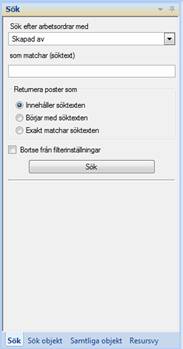 ”Sök” används för att söka efter specifik information i den valda fliken i presentationsfönstret när någon av flikarna Arbetsorder, Besiktningar eller Åtgärder är aktiverade i presentationsfönstret.