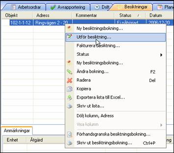 Det är givetvis även möjligt att registrera besiktningen direkt i Teknisk Förvaltning. Detta görs genom att högerklicka på den besiktningsbokning det gäller och därefter väljs ”Utför besiktning” enligt bilden nedan.